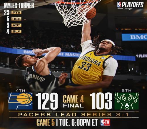 步行者在客场以129-103大胜雄鹿,将系列赛大比分改写为3-1;步行者全队8人得分上双,迈尔斯-特纳贡献23分5篮板3助攻4盖帽,哈利伯顿拿下17分8篮板15助攻1抢断,雄鹿后场核心利拉德受伤退赛,名记Chris Haynes报道称球员恐遭遇跟腱撕裂。