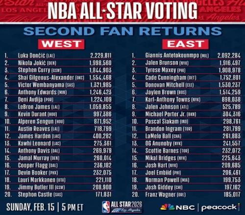 北京时间1月7日,NBA官方公布了2026年NBA全明星第二轮球迷投票结果,洛杉矶湖人后卫卢卡·东契奇与密尔沃基雄鹿前锋扬尼斯·安特托昆博,分别继续领跑西部和东部。东契奇以2,229,