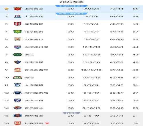 北京时间11月22日,随着最后一轮联赛8场同时开赛的比赛顺利进行,2025赛季中超联赛就此结束。30轮完整积分榜,上海海港领先上海申花2分,以绝对优势实现联赛三连冠。保级方面保级线